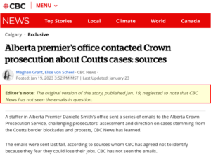 Smith’s critics certainly acted as though they smelled blood. There quickly followed the previously mentioned “news” story from the CBC alleging the existence of emails between Smith’s staff and the ACPS concerning the Coutts border blockade cases. The provincial NDP then dutifully called for an investigation. Yet the CBC’s story curiously failed to quote from such e-mails, raising suspicions that they might not exist. The federally-funded broadcaster later admitted it had never even seen them. Smith subsequently ordered an investigation, and after a reported search of 1 million emails covering a four-month span between every staffer and every Crown prosecutor nothing was found. It seemed the CBC’s story, if not fake news, was outrageously shoddy. Smith has struck back, asking for a retraction and an apology from the CBC (which, at time of publication, was not forthcoming).