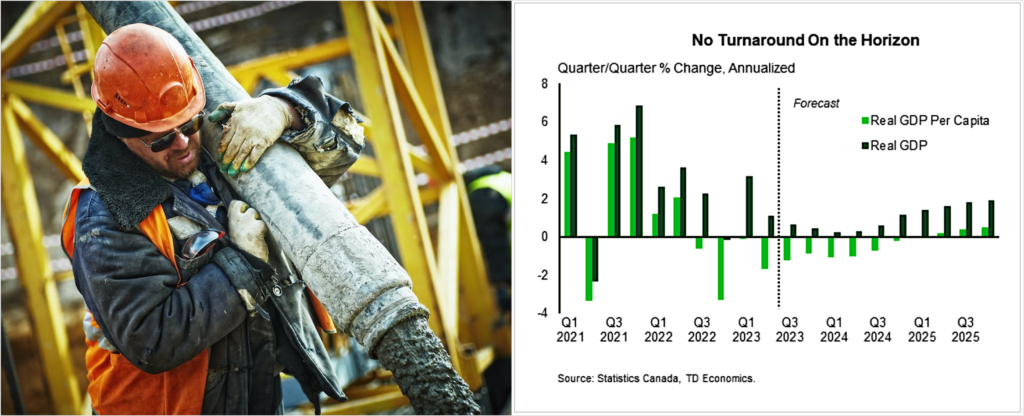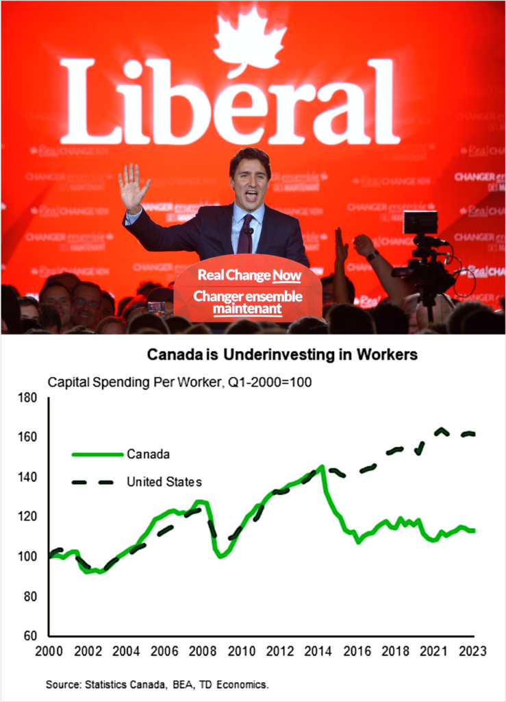And in this critical dynamic, Canada has been lagging the U.S. and even Europe for over 20 years. Today our GDP per hour worked is stalled out and may actually be regressing. The TD Economics report cited above forecasts that this key metric will continue to experience “persistent contractions” at least throughout 2024. Meaning Canada’s shortfall in productivity – and personal income – versus the U.S. and leading European countries will continue to increase.