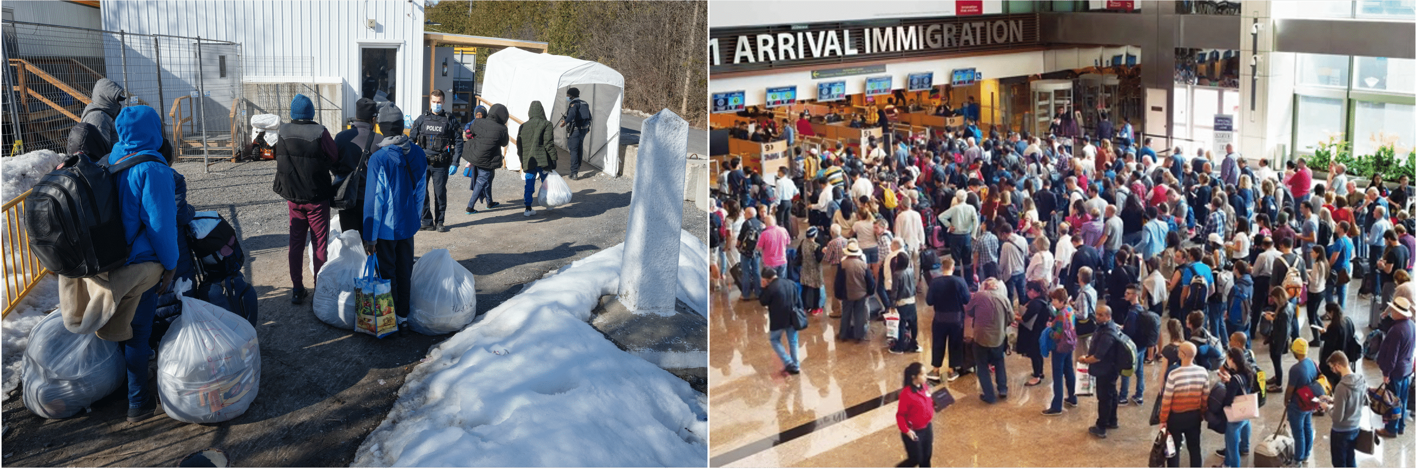 xThe great demographic experiment: Following a decade of surging immigration under Justin Trudeau’s Liberal government, culminating with 1.25 million immigrants in 2023 alone, Canada plans to continue admitting 500,000 new permanent residents annually, plus temporary workers and students. At left, asylum seekers from Colombia crossing the Canada-U.S. border between New York State and Quebec at Roxham Road, February 2023. (Source of left photo: The Canadian Press/Ryan Remiorz)