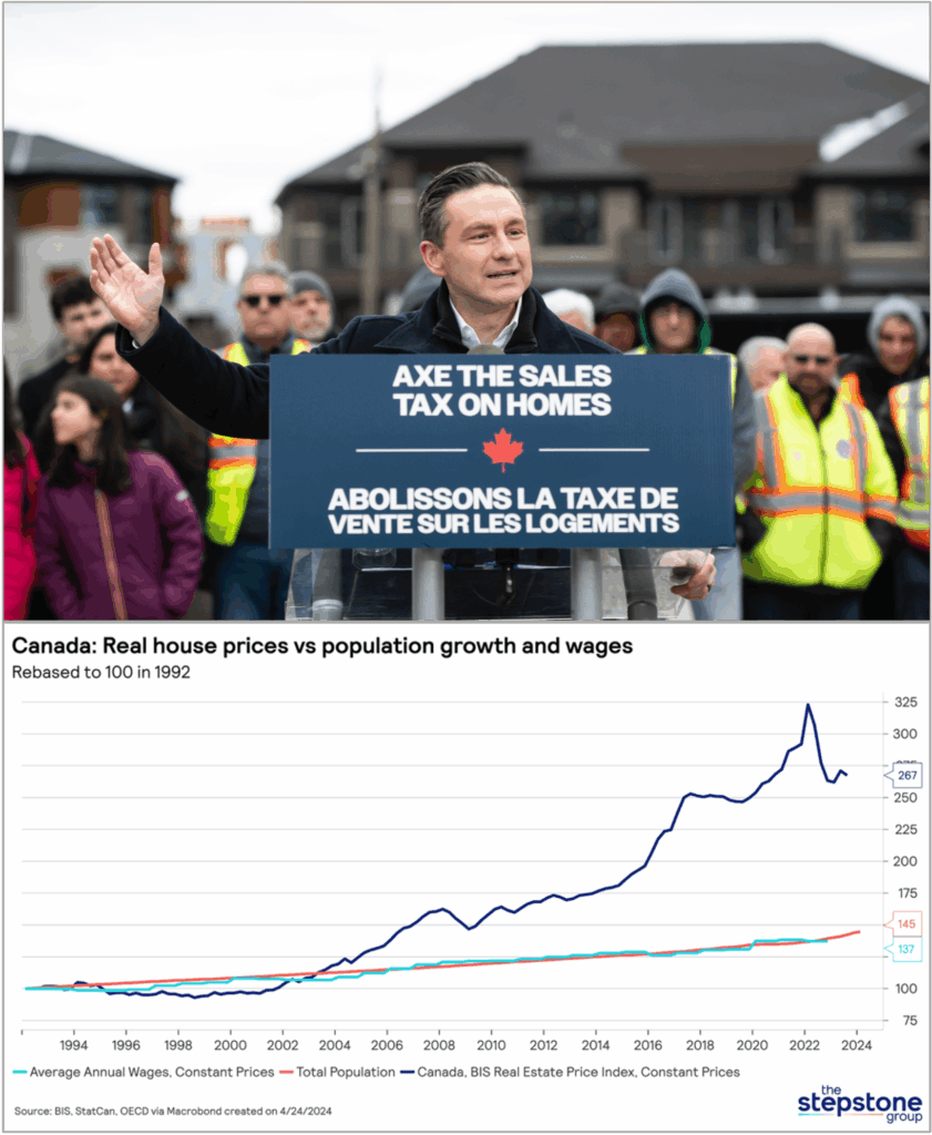 xTiptoeing around the root cause: With the average price of a new house now exceeding $700,000, Conservative Leader Pierre Poilievre often campaigned on issues of affordability during the recent federal election – while ignoring excessive immigration’s role in all of it. (Sources: (photo) The Canadian Press/Christopher Katsarov; (graph) The Stepstone Group)