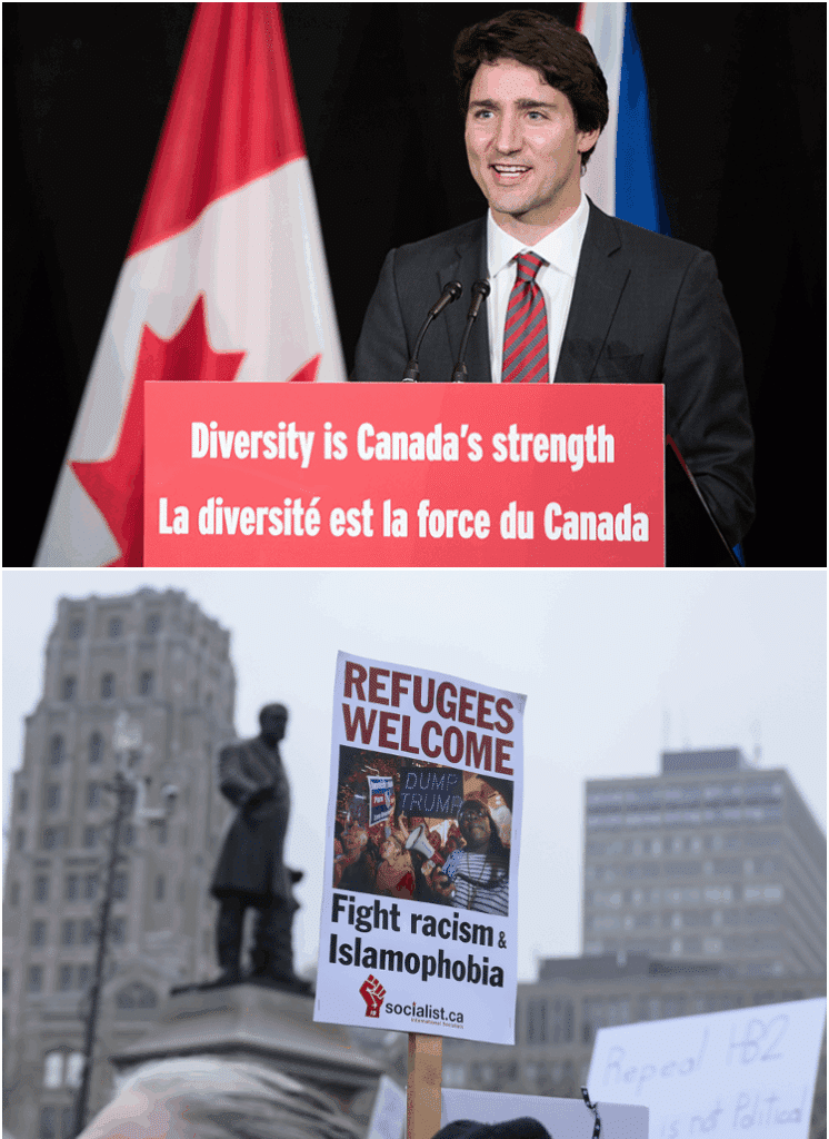 x“Diversity is our strength” became an expression of secular virtue for the Liberal government and its allies – while critics risked being denounced as racist, xenophobic or white supremacist. (Sources of photos: (top) Prime Minister of Canada; (bottom) arindambanerjee/Shutterstock)