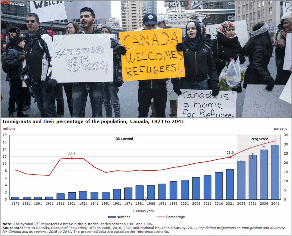 xCompassion without borders: Under the liberal universalist vision, the concept of citizenship is diluted and global humanitarian commitments are prioritized over a country’s economic, social and security needs; such a vision was behind the Trudeau government’s immigration policy and its call for “doing our part” on the world stage. (Sources: (photo) arindambanerjee/Shutterstock; (graph) Statistics Canada)