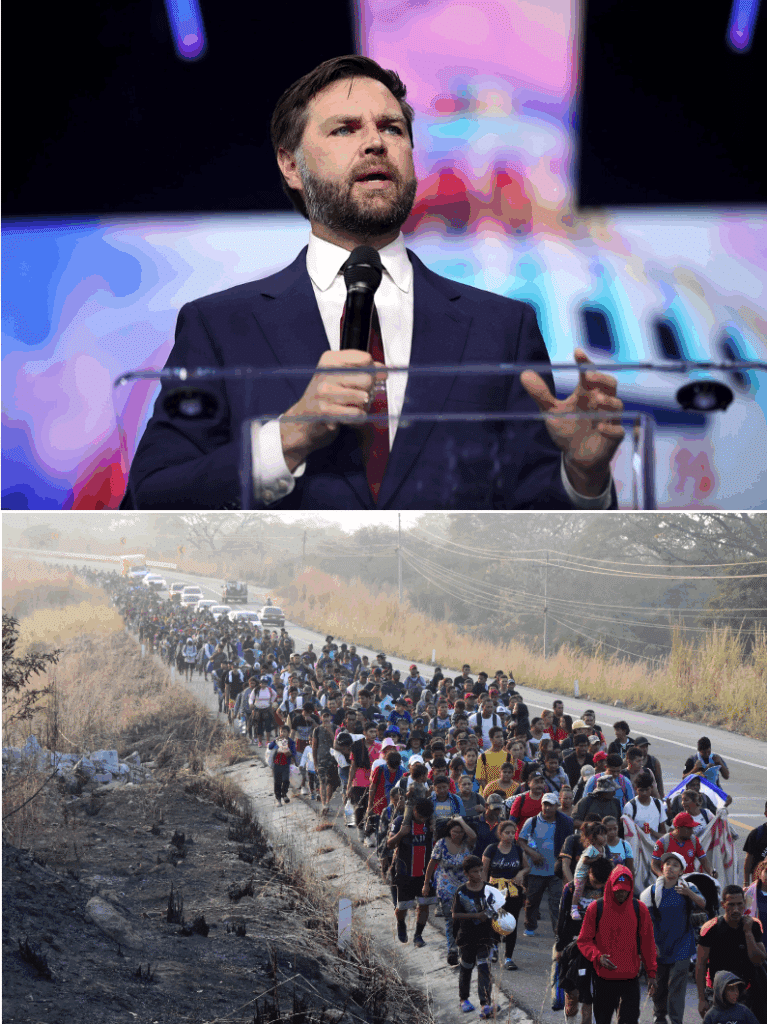 “A country that does not prioritize the well-being of its own citizens is…a failed country,” declared U.S. Vice President J.D. Vance (top) in a recent international speech; Vance also argued that national cohesion and basic moral order begins with the individual’s natural affections for family, then extends outward to community, and culminates in the love of country. At bottom, migrants heading northward through Chiapas state, Mexico, January 2024.