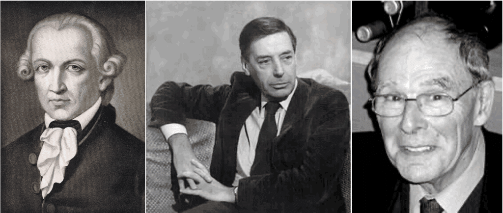 “Our commitments are lived, not theorized”: Contrary to the universal moral ideal professed by 19th century German philosopher Immanuel Kant (left), British philosopher Bernard Williams (middle) thought of ethical obligations as stemming from concrete human ties. Likewise for Australian philosopher David Stove (right), preferring a stranger over one’s own countrymen was not morality but “moral derangement”.