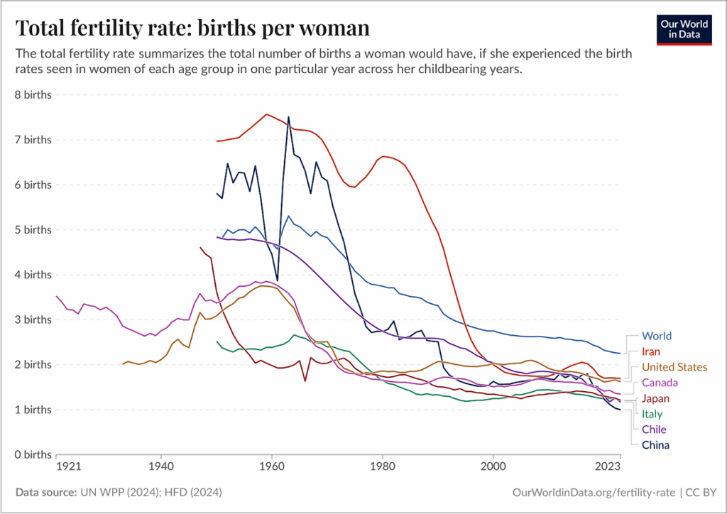 This is now the case in fewer and fewer places. Even replacement-level fertility is increasingly rare. Birth rates have sagged or plunged not only in relatively well-known cases like Italy, which went from 3.3 births per woman in 1920 to 1.24 a century later, or Japan (5.2 in 1920; 1.33 in 2020), both of which became developed and largely secular countries during this period, but in less-developed and until recently devout countries such as Chile (which has plunged from 5.9 births per woman to 1.54 over that century) and Iran (from 7 in 1920 – and still well over 6 in the mid-80s – to a below-replacement 1.71 in 2020).
