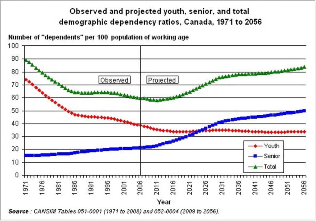 Money for these transfers and services came through taxing the working-age population. As long as the population of younger workers greatly outnumbered those in need of transfers and services, the welfare state seemed destined for success. I am referring to the so-called dependency ratio, which Statistics Canada defines as “the ratio of the combined youth population (0 to 19 years) and senior population (65 or older) to the working-age population (20 to 64 years).”