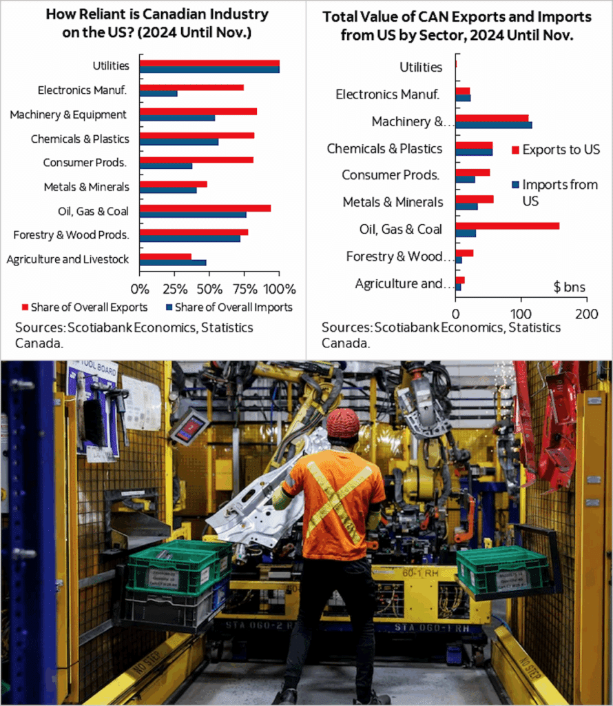 xNo escaping basic facts: The U.S. market supports 2 million Canadian jobs and consumes at least 75 percent of Canada’s exports in every sector except agriculture and metals/minerals. At bottom, a worker stamps automobile components at a Martinrea International Inc. plant in Woodbridge, Ontario. (Sources: (charts) Scotiabank; (photo) Evan Mitsui/CBC)