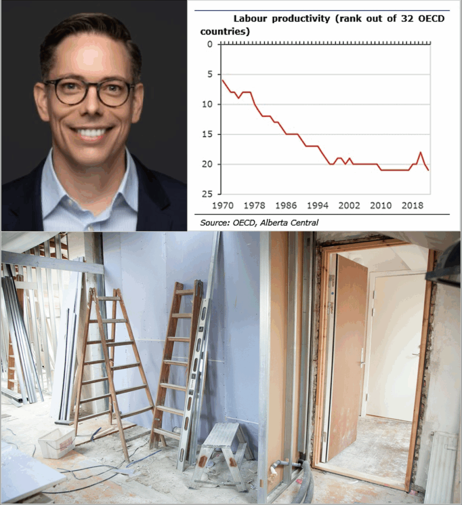 x“Can we even still call ourselves a trading nation?” Charles St. Arnaud (top left), chief economist at Alberta Central, has charted the precipitous decline in Canada’s labour productivity from 6th among 32 OECD nations to 22nd today. As St. Arnaud explains, this is largely because Canadians have chosen to invest in housing rather than productivity-enhancing machinery, equipment and intellectual property. (Sources: (graph) Alberta Central; (bottom photo) Pexels)