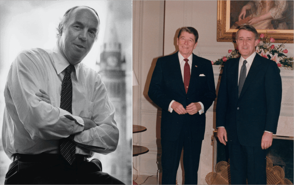 Course correction: Following a lengthy recession exacerbated by Third Option policies, Trudeau set up a Royal Commission in 1982 headed by former finance minister Donald S. Macdonald (left) to chart a new path for Canada’s economy. Macdonald’s final report recommended that Canada seek a free trade deal with the U.S., which Prime Minister Brian Mulroney (right photo, on right) and U.S. president Ronald Reagan (right photo, on left) signed in 1988.