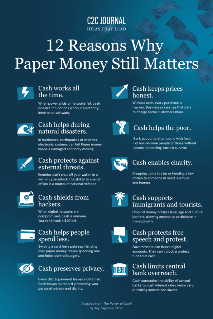 Ottawa’s ongoing anti-cash campaign either naively or deliberately overlooks the many ways in which paper money outperforms its digital and plastic simulacrums. Zagorsky’s The Power of Cash offers a full one-dozen reasons (published in the accompanying table) why maintaining cash is crucial to a fair, democratic and liberal society.