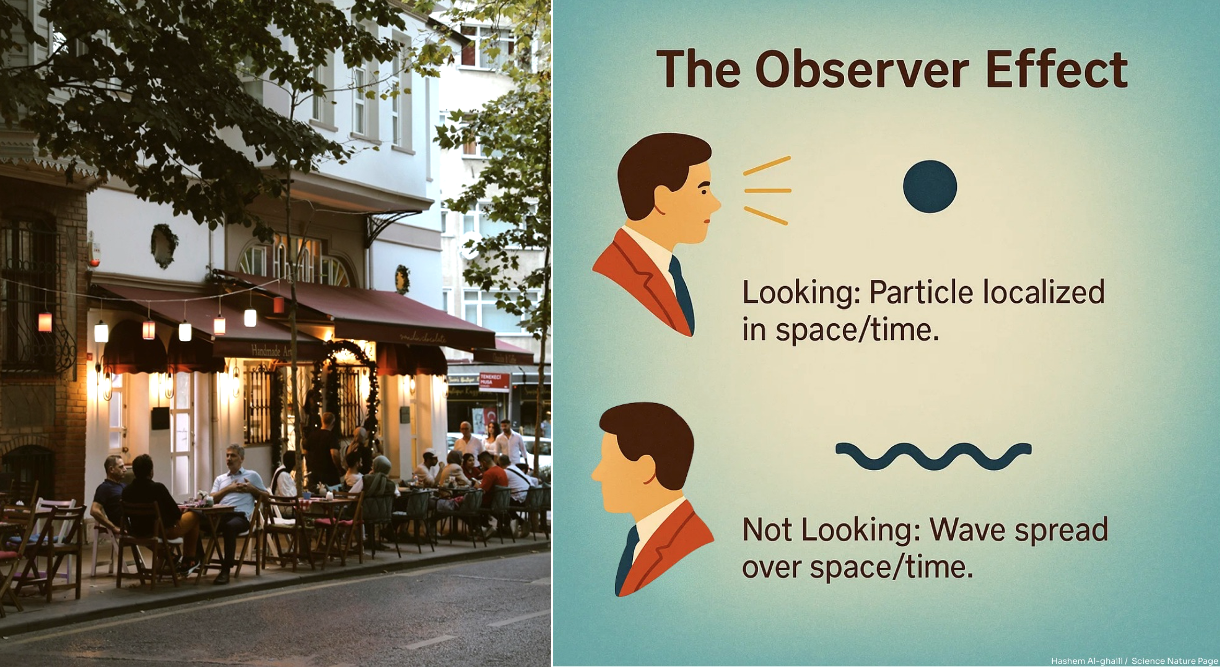 Non-local events, however, are categorically different. In the quantum milieu, the object fluctuates in a cloud of probabilities called a wave function which collapses only with observation, allowing the “particle”, which did not exist in a particular time or position prior to the observation or measurement, to suddenly appear. Were we living in the quantum field, we might as well give up planning for a meal out since we could neither pre-arrange for a time nor have any idea where the restaurant would be when we left the house. It would not appear at all unless we correctly guessed its location and went there to “make a measurement”, as the physicists like to say.