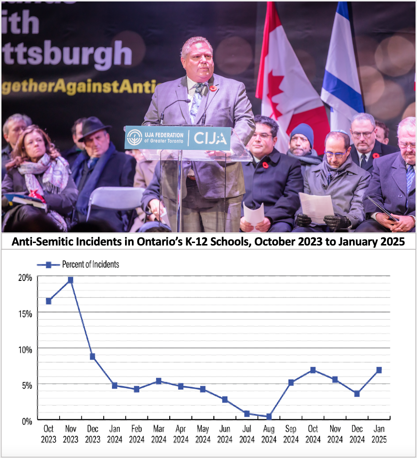 To its credit, however, Ford’s Progressive Conservative government has slowly come around on the issue of virulent anti-Semitism in Ontario’s schools. Four years ago, Toronto District School Board (TDSB) Trustee Alexandra Lulka raised the alarm that materials being distributed in the system were anti-Semitic and promoted terrorism; the Jewish trustee was censured for doing so. But by this year, a government-commissioned report had identified nearly 800 instances of anti-Semitism in Ontario’s K-12 schools – including Nazi salutes, swastikas, intimidation and swarming of Jewish students – in just the 16 months from October 7 through January 2025.
