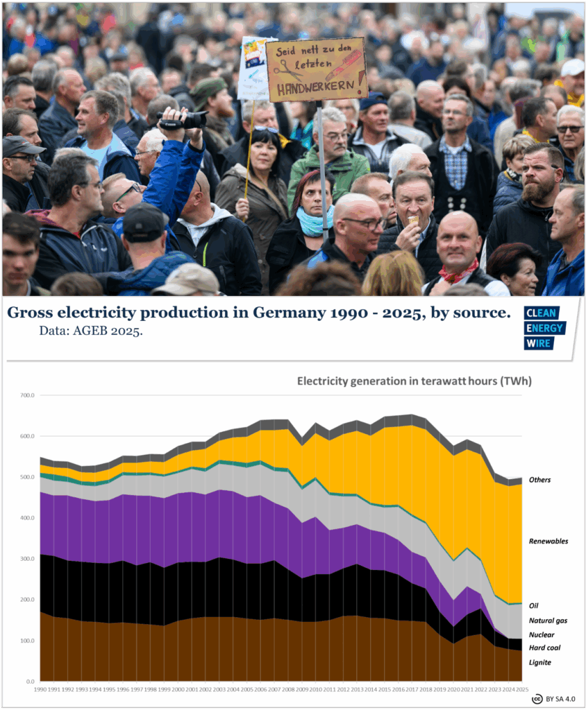 Begin with economic policy, specifically energy policy. Reliable, affordable energy is key to any country’s economic well-being. In 2002, Germany’s 11 nuclear power plants generated more than one-quarter of its electricity, with coal and natural gas supplying most of the rest. “Renewables” were just getting going at the time. Since then, huge investments in solar and wind power have been made, with ugly wind turbines and solar farms blighting more and more of the pretty German countryside as well offshore zones in the North Sea. The original intention was to phase out fossil fuels and drive down greenhouse gas emissions to meet Germay’s international commitments. But driven by an irrational anti-nuclear-power campaign by environmental zealots and Green Party politicians, Germany’s plan then morphed into generating so much power from wind and solar so as to also allow the shutdown of all of Germany’s zero-emitting nuclear plants by 2036.