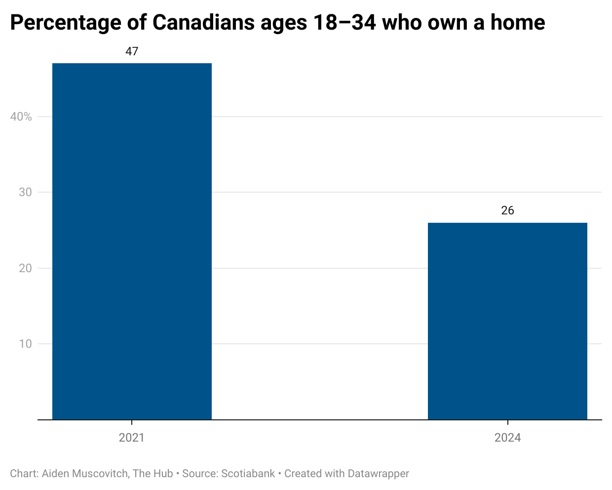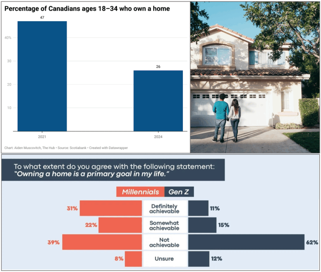 No wonder only 26 percent of Canada’s 18-34-year-olds (a span not precisely matching Gen Z, but close) owned a home in 2024. That is down from 47 percent just three years earlier. I had to triple-check those figures, because a 21 percent plunge in such a short time seemed unbelievable, but it’s straight from Scotiabank’s 2024 Housing Poll. And for most of the lucky 26 percent, homeownership only came about thanks to financial help from parents. For three out of every four Gen Zers, it’s an increasing struggle even to save enough for a down payment. Indeed, as the Scotiabank report noted, “Around 29 percent of people in that age group are now living with parents or family, up from around one-fifth of those surveyed three years ago.”